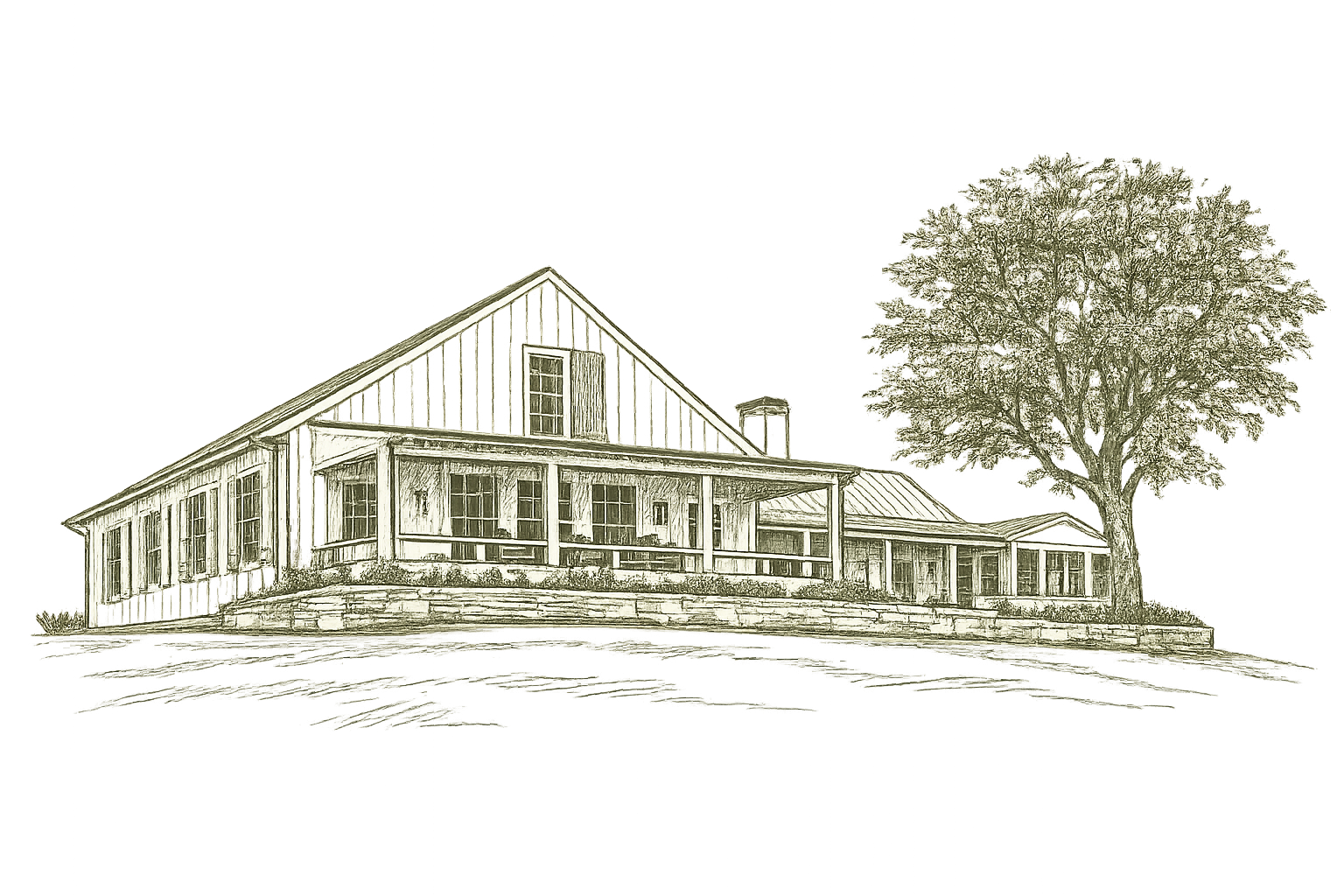Perched atop the rolling hills, a white shiplap home now stands, surrounded by beautifully landscaped gardens and inviting outdoor spaces. Inspired by traditional dance halls, it was designed to bring people together in a setting of warmth, beauty, and ease.